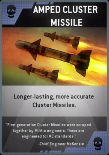 Amped Cluster Missile is a Burn Card featured in Titanfall. It replaces your next titan's ordnance with more accurate, slightly longer lasting, Cluster Missiles. Rockets fires almost straight, tending to drop downwards and to the right noticeably after a distance. It lasts about a split second longer.
