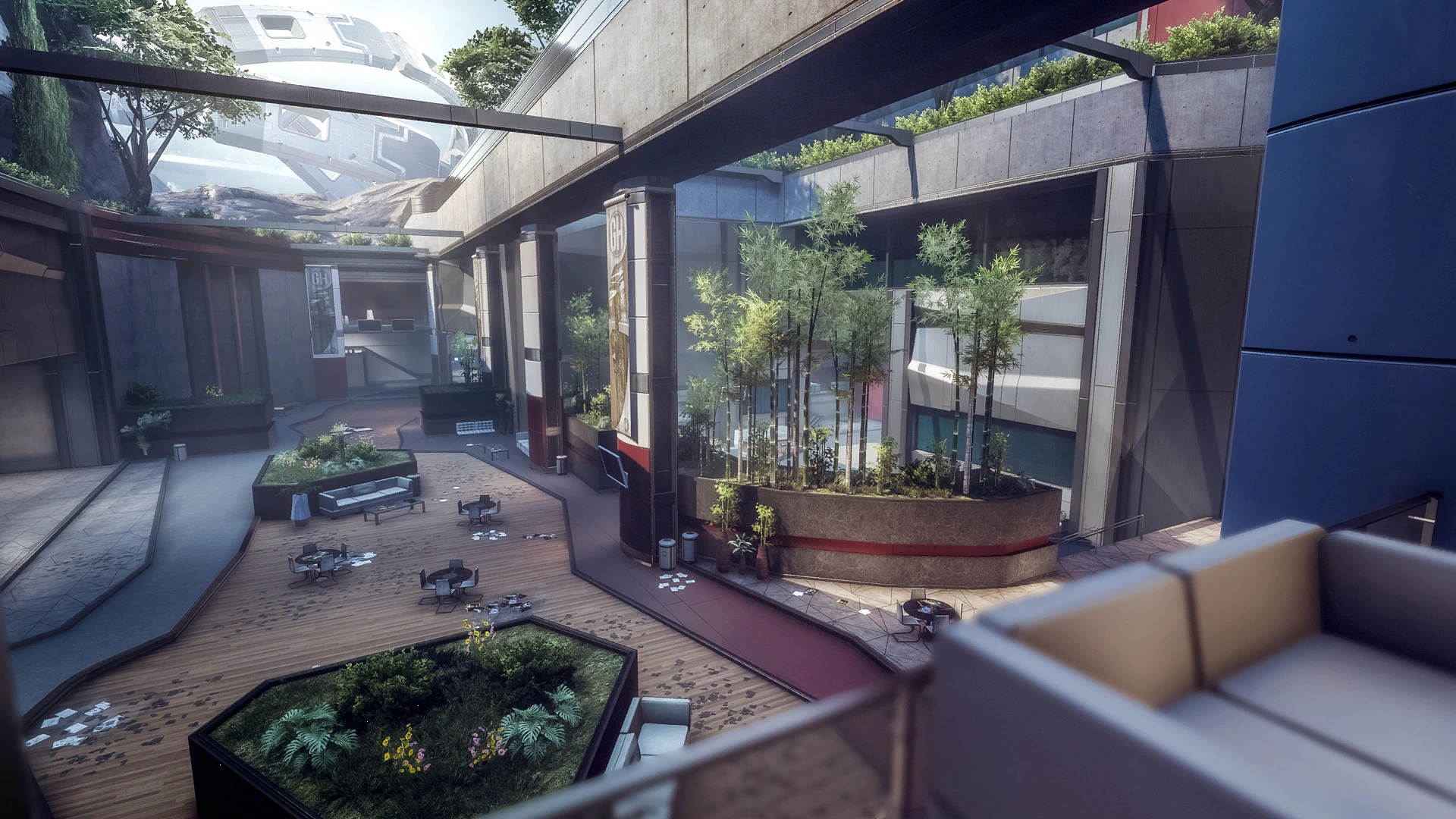 - Pilots can attack Titans from above the hallway, as the broken skylight glass and supports are not out of bounds. One can camp up there with a Charge Rifle, zapping away Titan health while being hard to hit or even unnoticed. The easiest ways to reach up there are by Grappling or ejecting from a Titan.