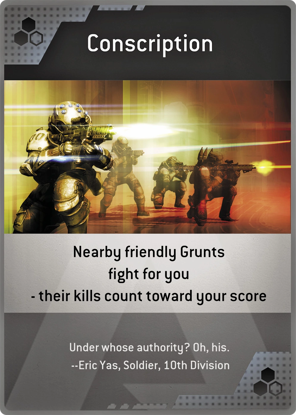 Conscription is a Burn Card featured in Titanfall. When activated, nearby friendly Grunts will start following the player & their kills count toward the player's score.