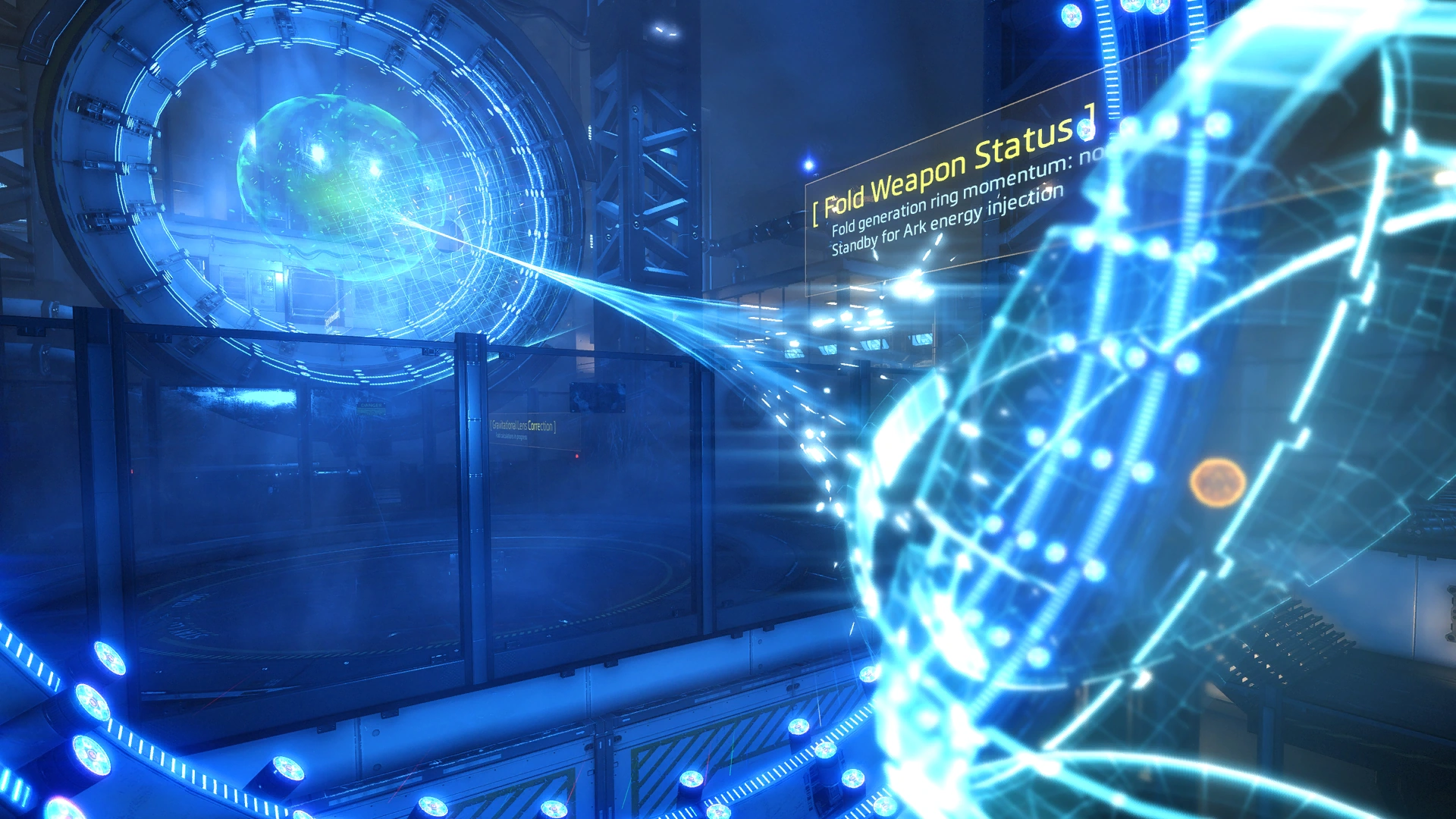 When prepared to fire, the Fold Weapon appears to 'spin up' its three concentric rings, before a power source - a piece of technology nicknamed the Ark by researchers - is injected into the centre of the sphere.