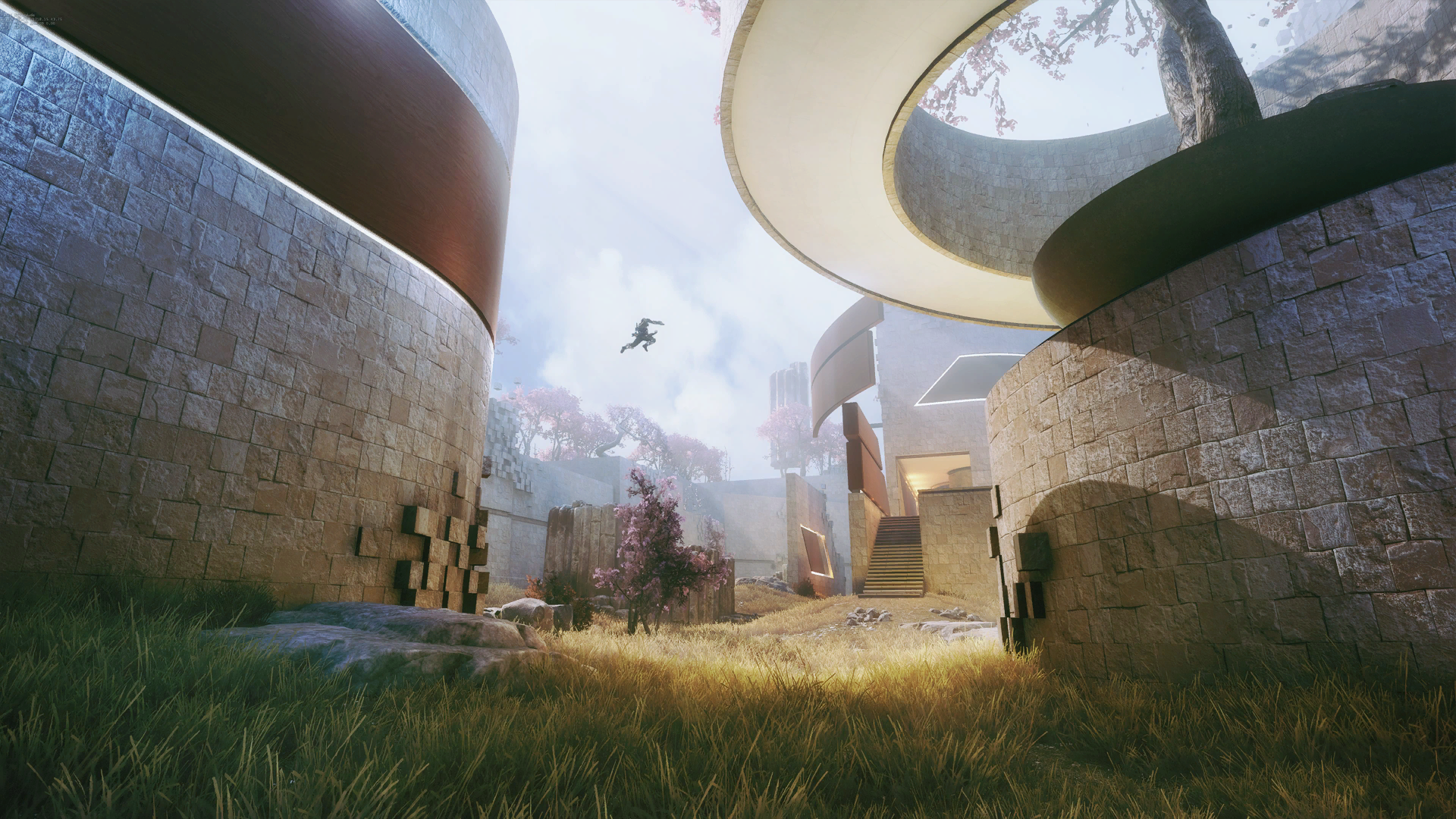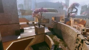 The stage's architecture is primarily stone, either carved block walls, or natural basalt columns similar to those found on Homestead. Cherry trees and red wooden panels and glass decorate many areas of the map, lending a powerful feeling of tranquility greatly at odds with the carnage occurring there. Gravity does not always work correctly, and it's common to see blocks floating in the air near walls and water falling upwards in the many streams crossing the stage.