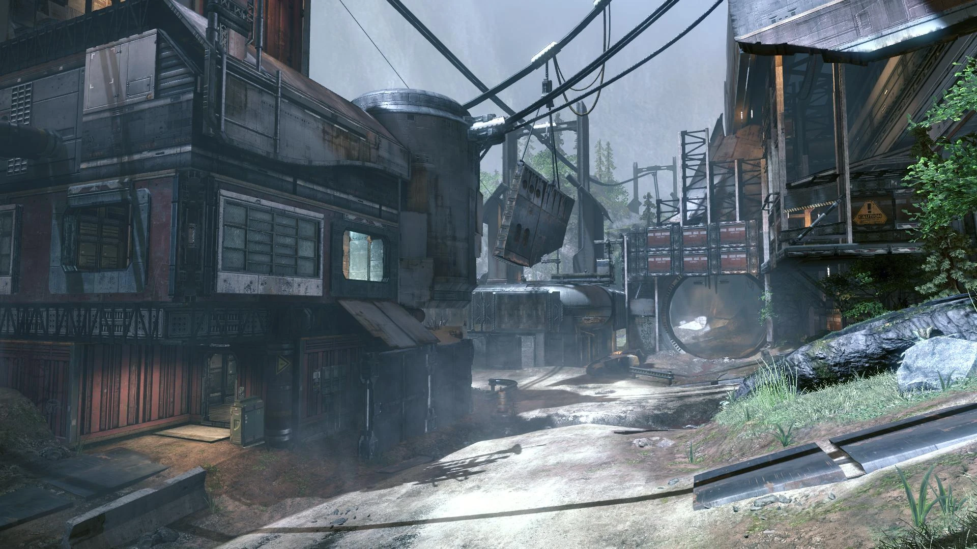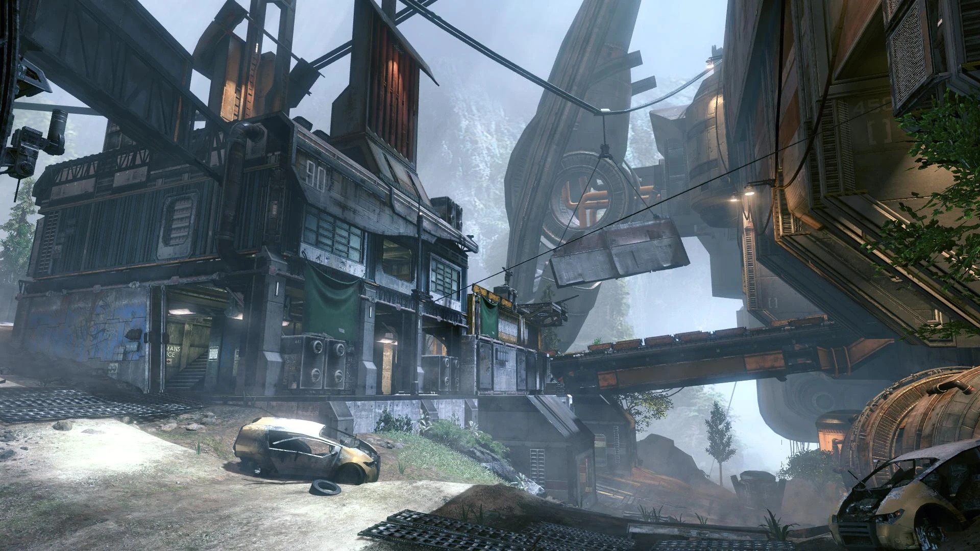The small town around the ship's wreckage is just as fully-furnished as the Colony in the valley below, with bars, cafes, worker housing, garages and all the tools necessary to transport material and supplies to and from the site. Several pieces of wreckage, suspended from wires, have been maneouvred into place by mutineer Pilots to assist with Wall-Running around the site, allowing ease of access to otherwise inaccessible portions of the ship.[5]