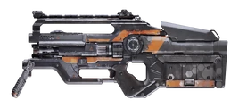 It performs at 45 damage and 34 accuracy. Its listed magazine size is the amount of rounds the weapon can fire in succession before it completely overheats, in which case a reload animation plays where the upper receiver pops open while the pilot fans the inside to disperse the heat, then replaces several parts in the stock and barrel, most likely a melted component and a battery.