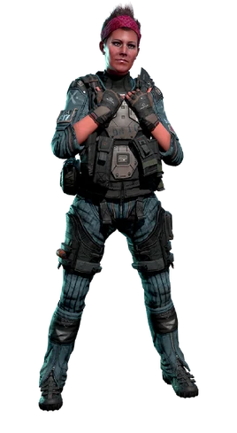 Sarah Briggs is a supporting main character in Titanfall and Titanfall 2. Rising as a covert operative to become a commander of the Special Recon Squadron (SRS) and its sub-section, the Marauder Corps (M-COR), she is one of the central figureheads of the Frontier Militia. Though known to have Pilot training, Sarah is usually shown in a field command role, providing logistics and important information to Pilots on the ground such as when they can deploy their Titan; she is still known to occasionally embark on special, usually covert, missions, even personally deploying onto a battlefield with a Titan when necessary.