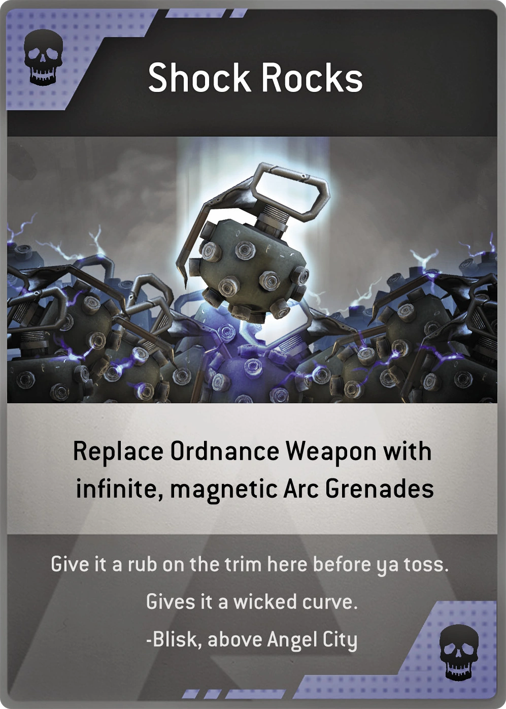 Shock Rocks is a Burn Card in Titanfall. Gives the Pilot a self replenishing supply of Arc Grenades, which also are magnetically attracted to nearby titans or spectres like the Mag Launcher. One Arc Grenade is replenished every 8 seconds.